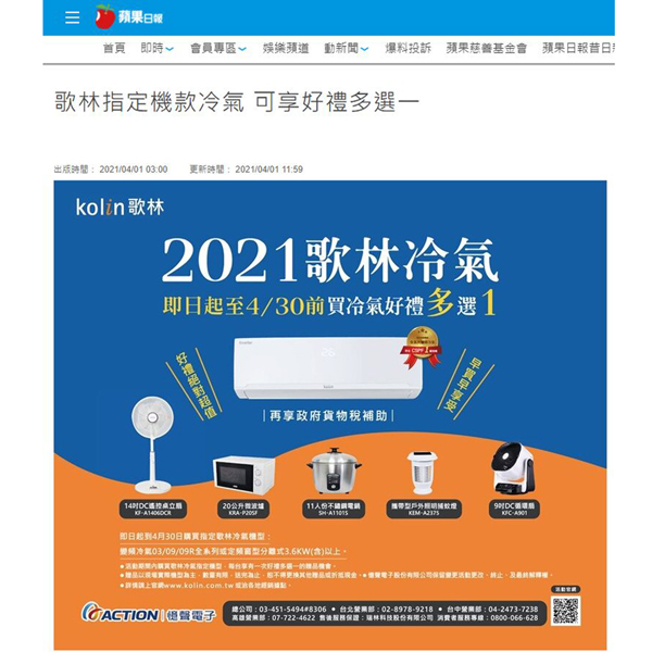 歌林指定機款冷氣 可享好禮多選一(蘋果日報)
