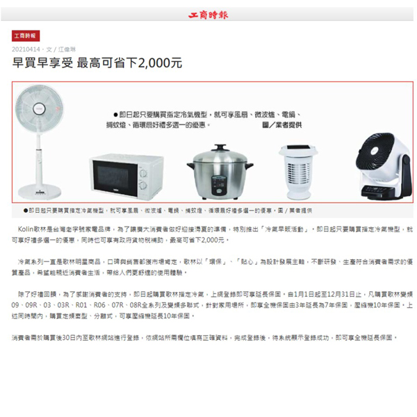 2021歌林「冷氣早販」活動現在已開跑。消費者只要於即日起到4月30日...