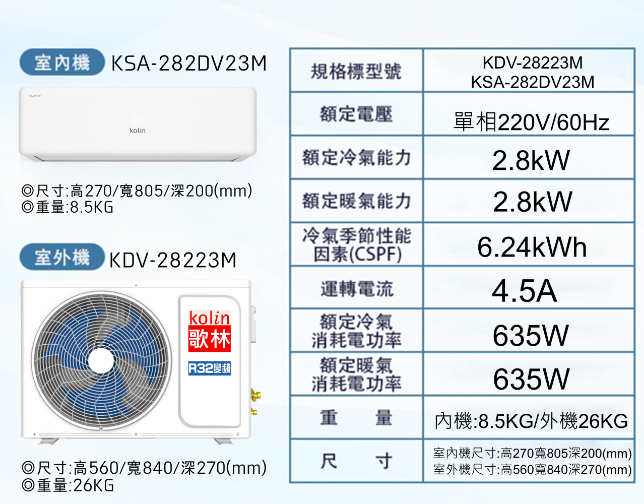 - 1. 額定冷氣能力:冷2.8Kw/暖2.8Kw